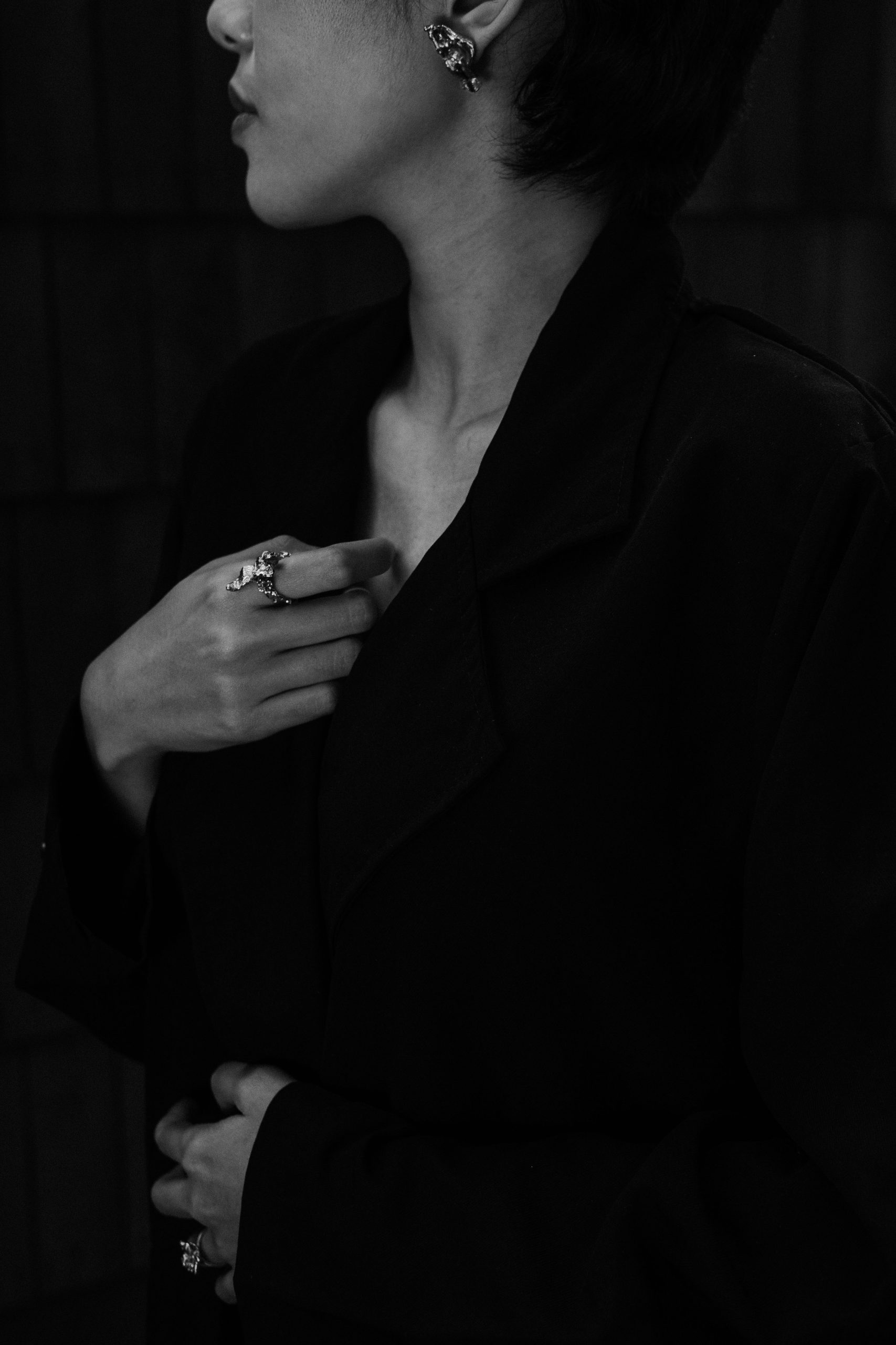 To embody the identity of Gelap Ruang Jiwa, we styled the model in black clothing, creating a powerful contrast that highlighted the brand’s jewelry pieces—earrings, necklace, and ring—worn simultaneously for a cohesive, layered effect. This styling choice, paired with a striking silver backdrop, echoed the brand’s themes of depth and resilience.