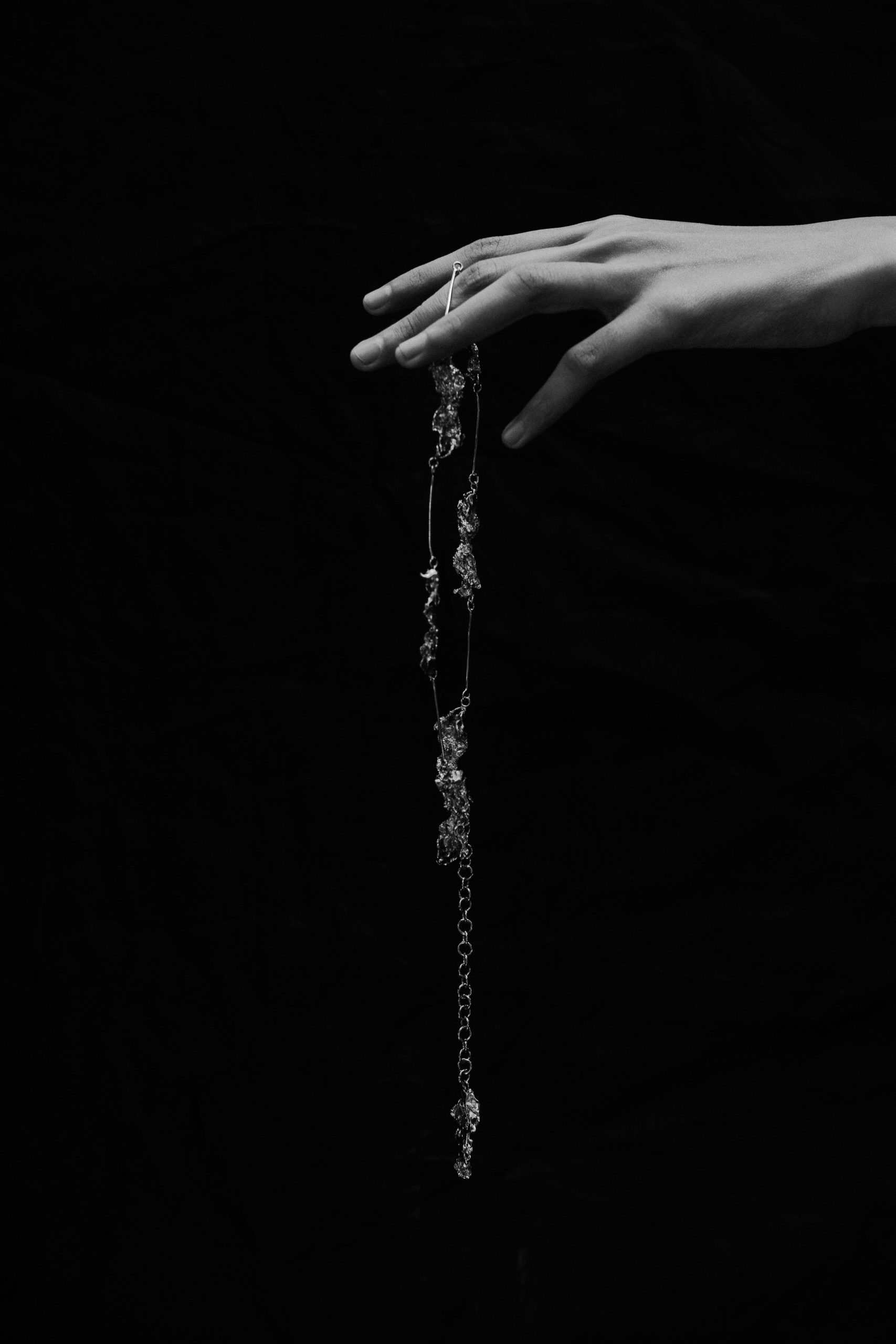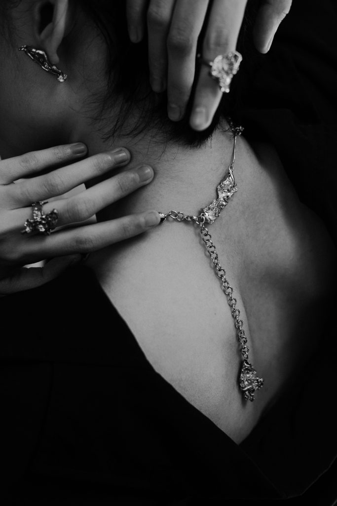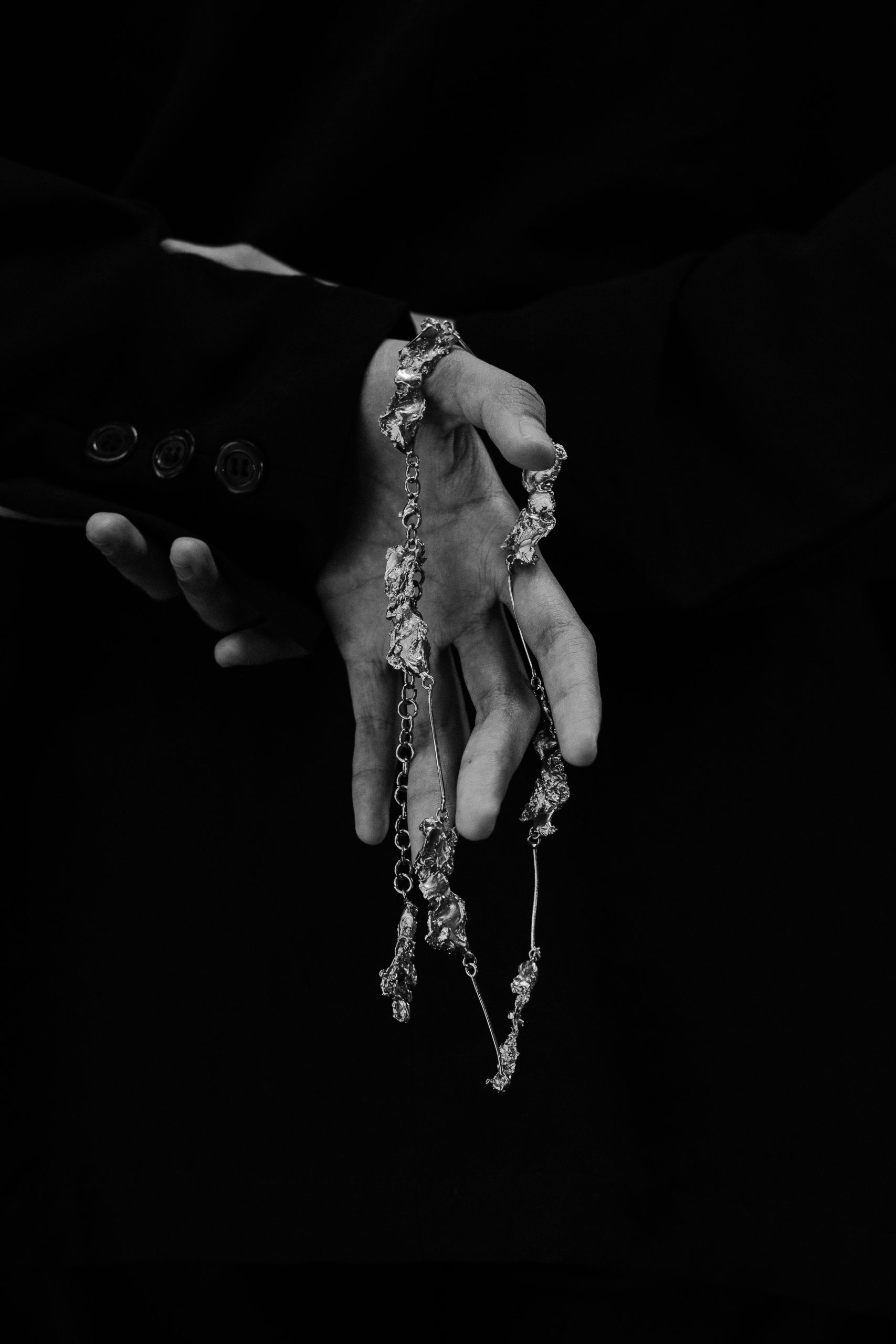 The black attire symbolized the “dark room of the soul,” while the silver background, chosen by Syncro, enhanced the overall visual impact, reflecting the abstract and textured quality of the jewelry. Together, these elements created a visually compelling aesthetic that captured the brand’s essence and added a sense of mystique and intensity to each shot.