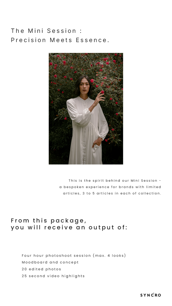 At Syncro, we understand that sometimes, a whisper can speak louder than a shout. This is the spirit behind our Mini Session – a bespoken experience for brands with limited articles, 3 to 5 articles in each of collection.