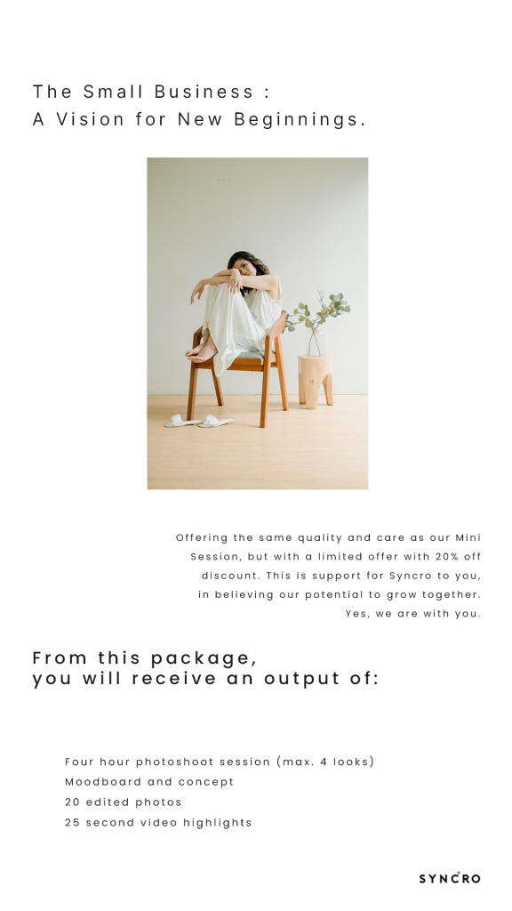 We understand that the importance of a good-first impression, and our package is designed to bring your brand’s vision to life, just as you as the owner envision it. Offering the same quality and care as our Mini Session, but with a limited offer with 20% off discount. This is support for Syncro to you, in believing our potential to grow together. Yes, we are with you.